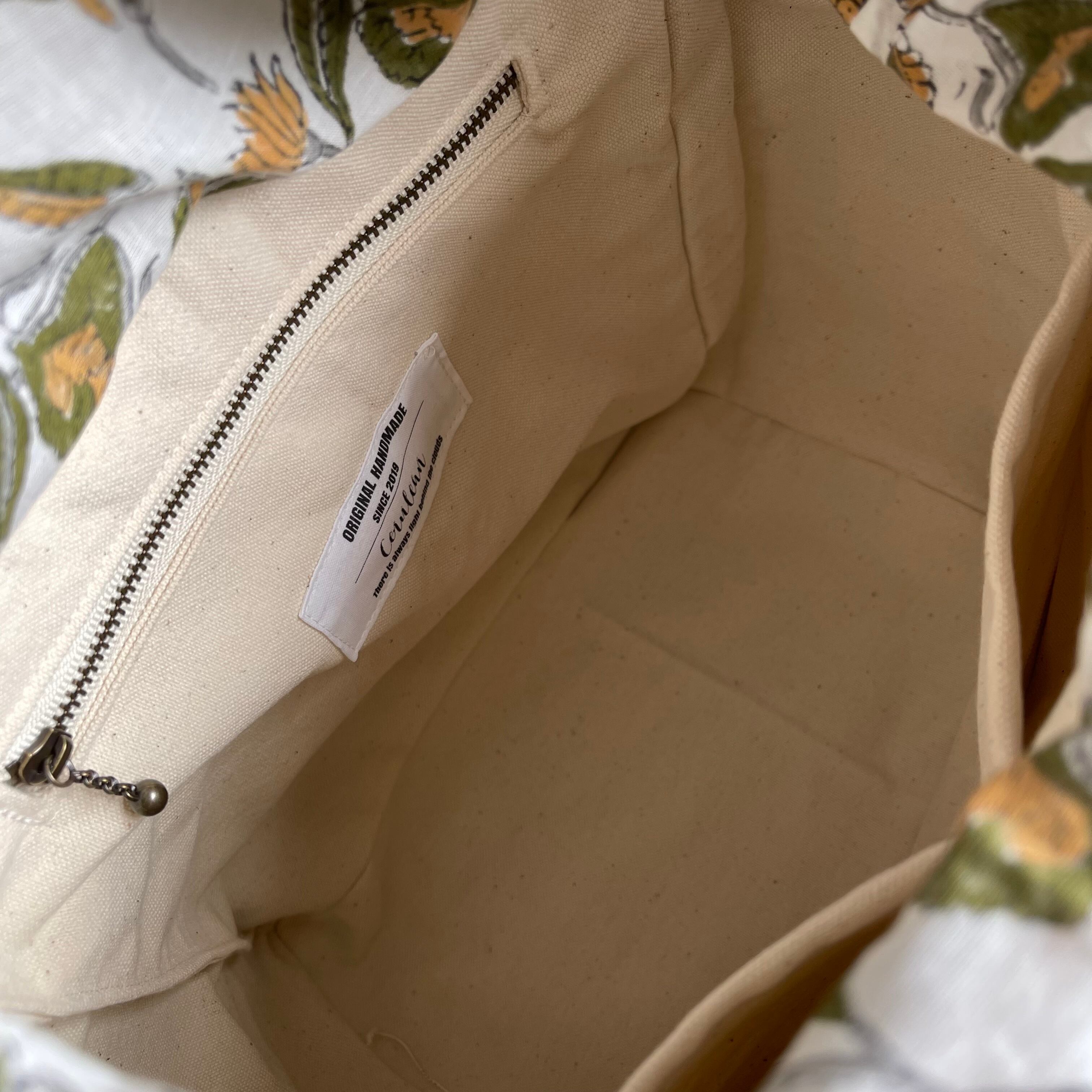 花柄の生地は草木染めのブロックプリントで手作業で染めています。