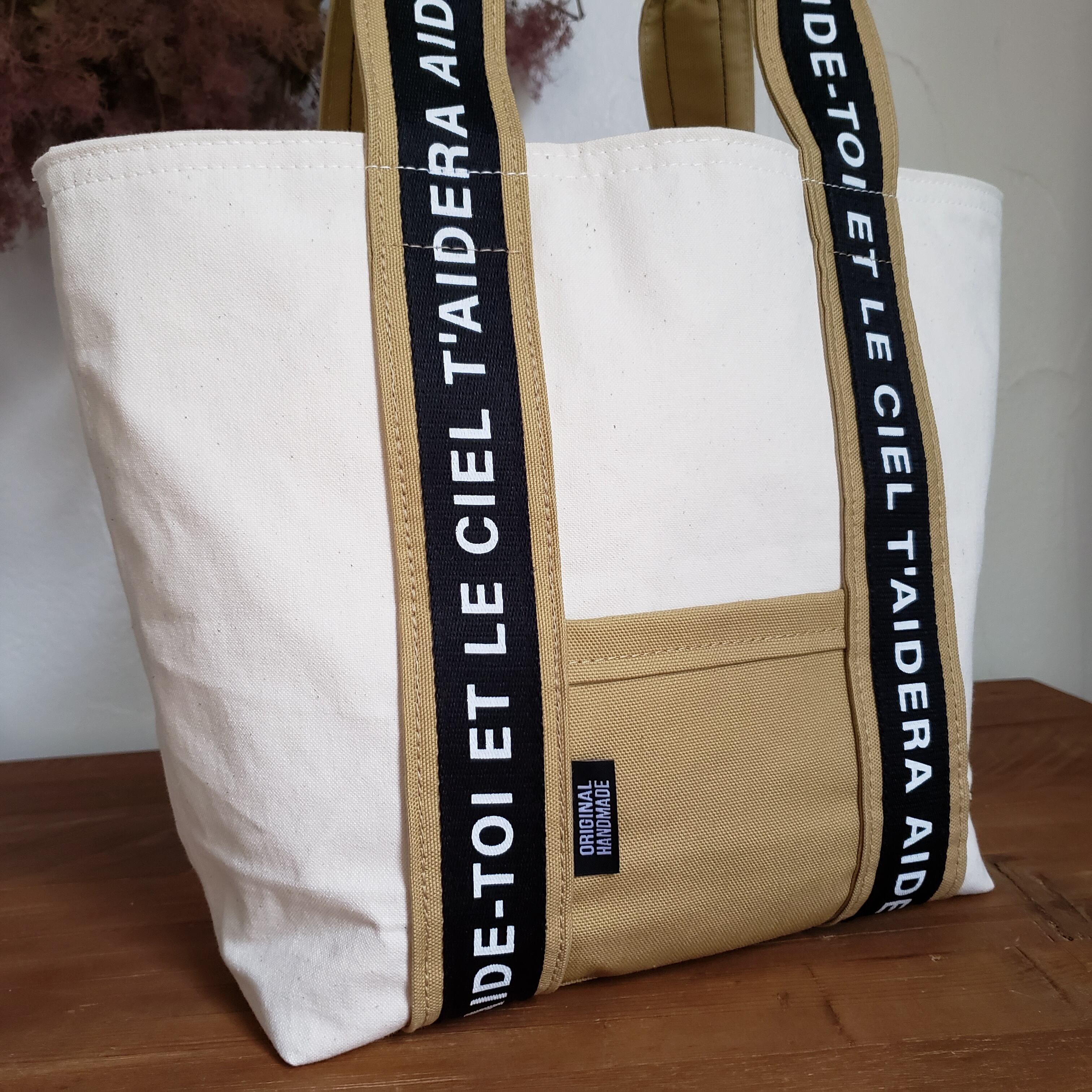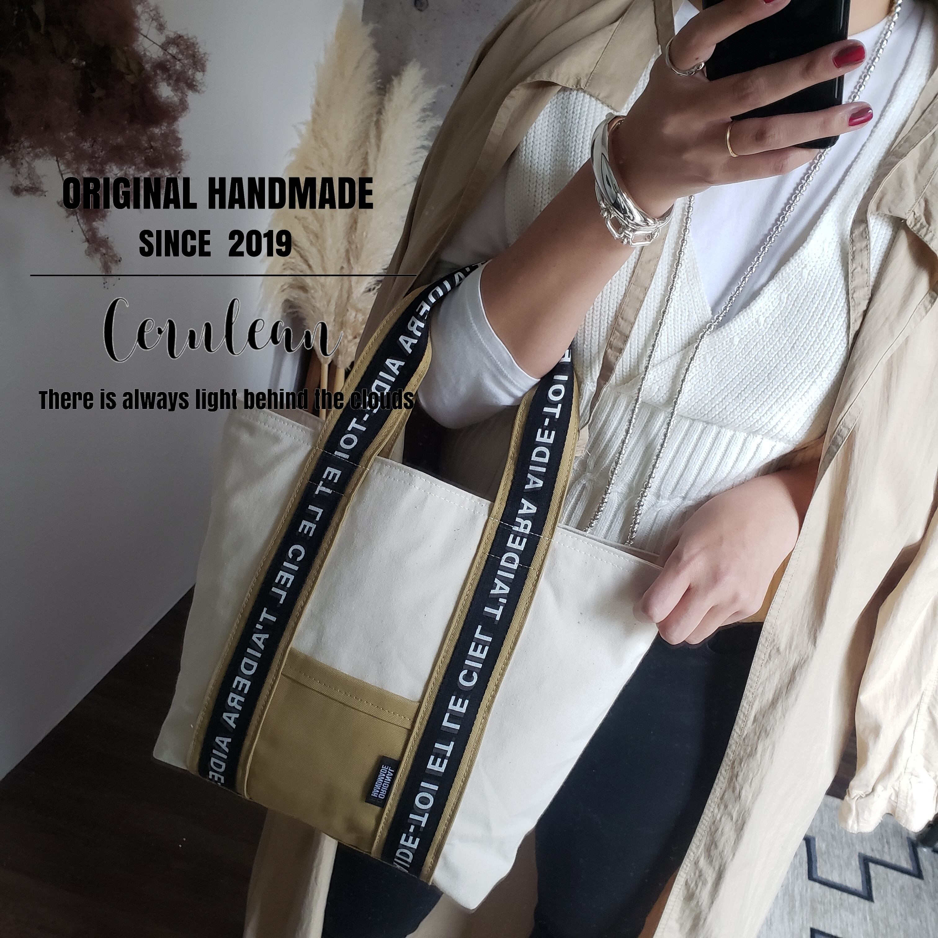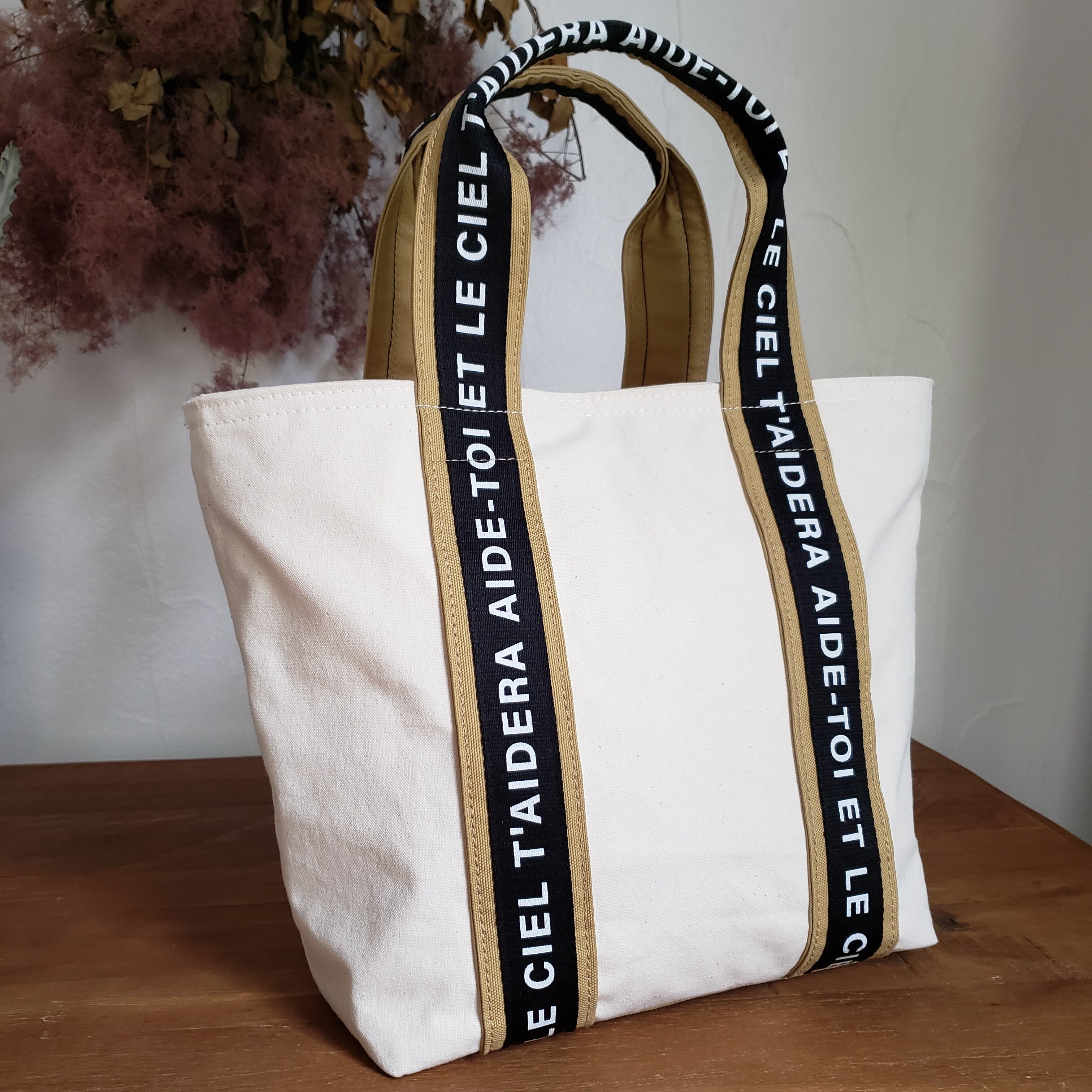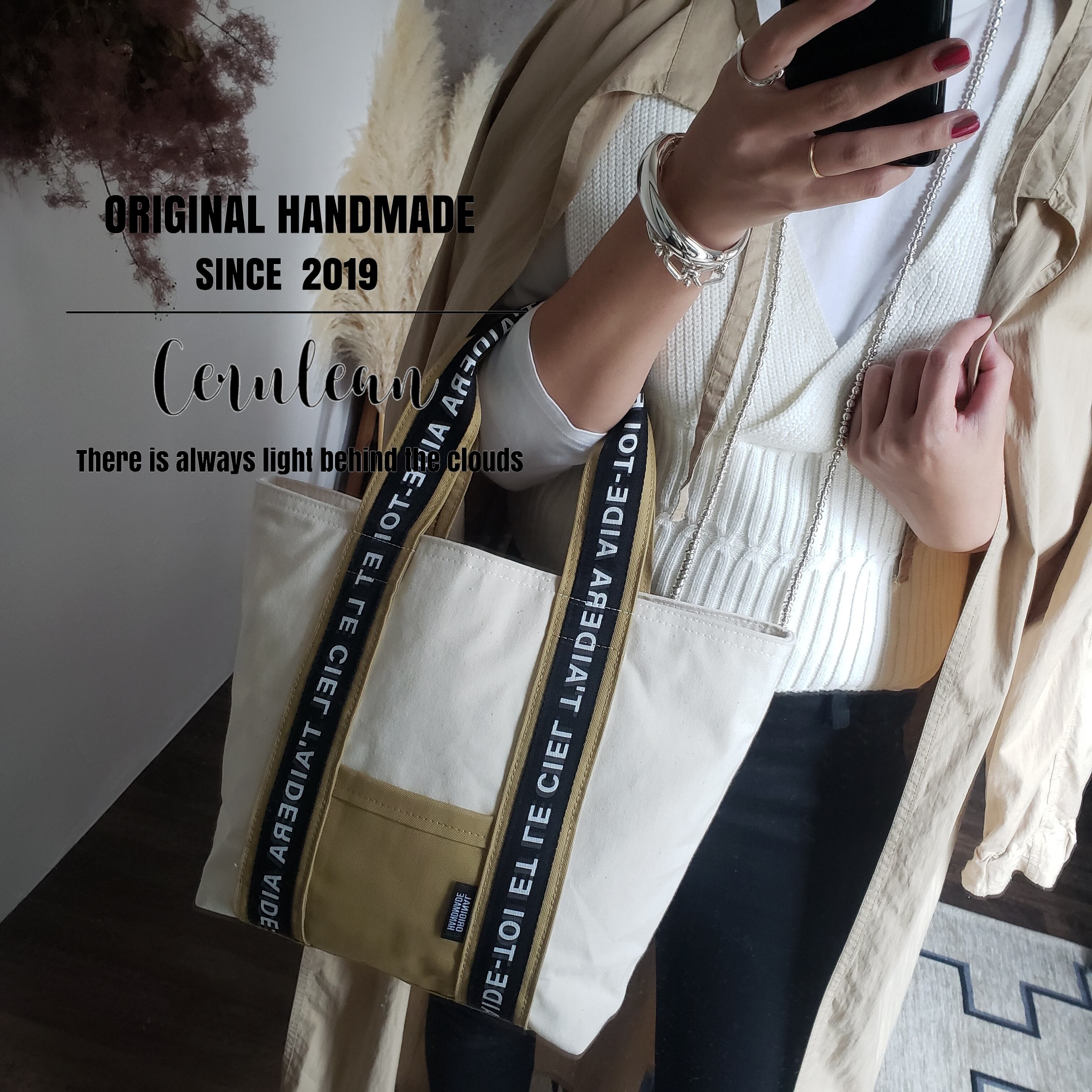 C125*帆布×ロゴテープのトートバッグ アイボリー×ベージュ