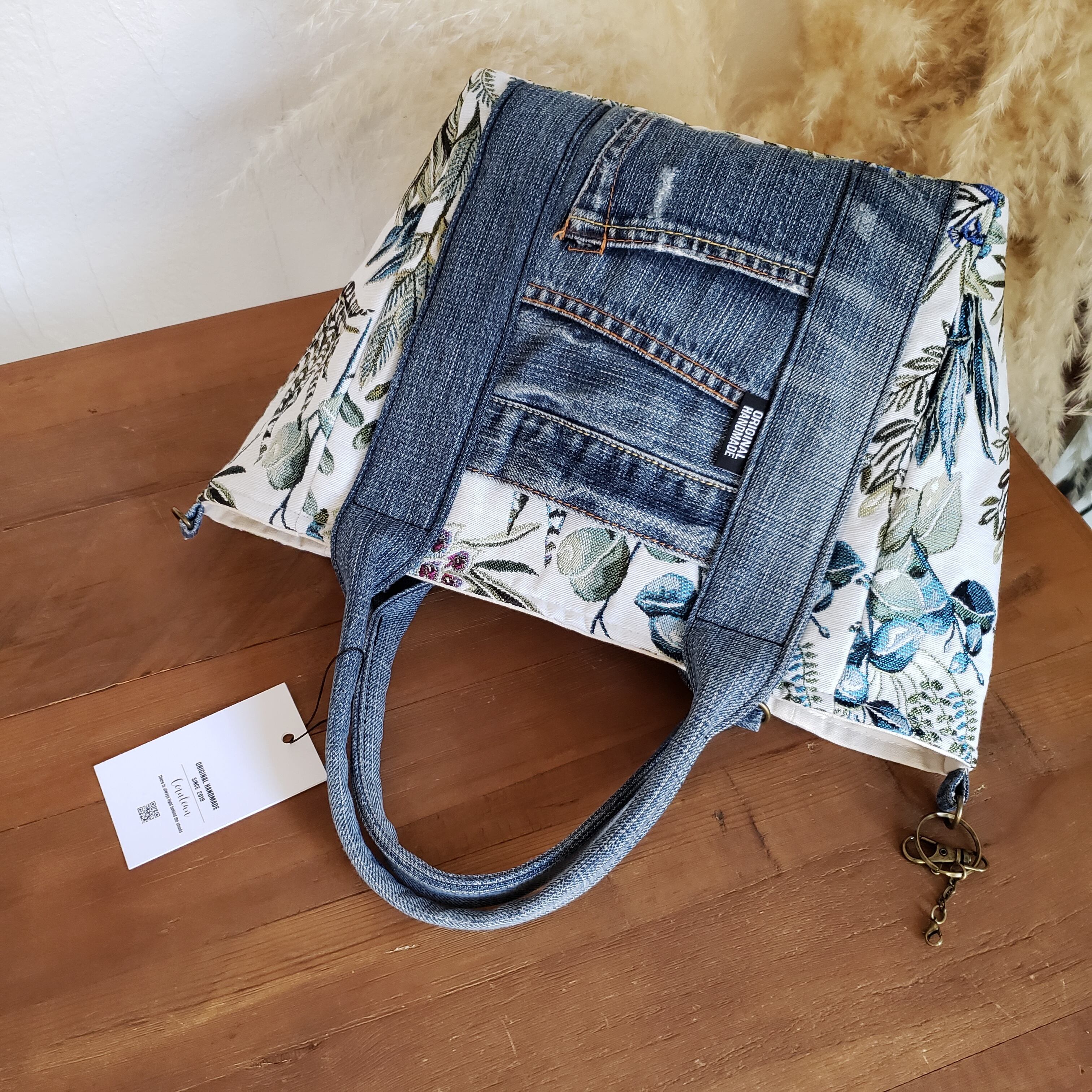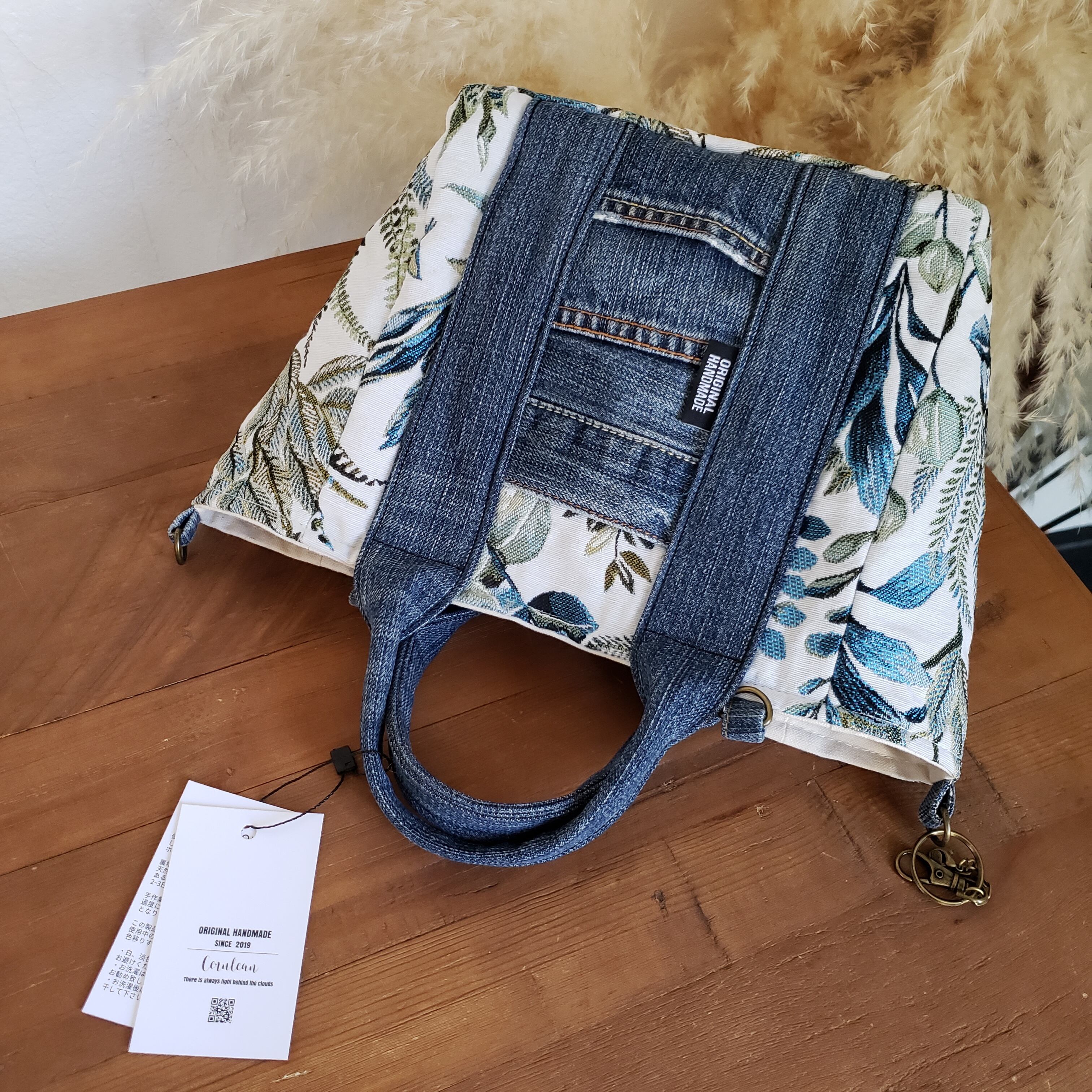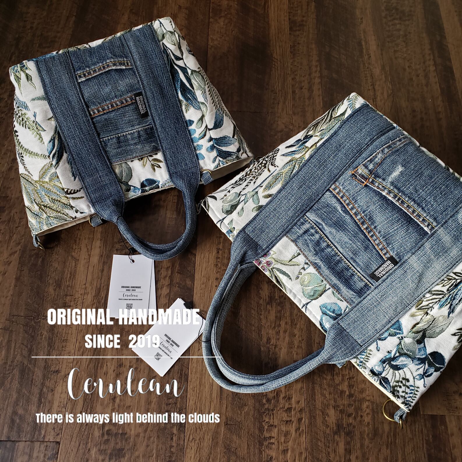 ■C144 デニム×ボタニカル柄のトートバッグ Mサイズ 6200円